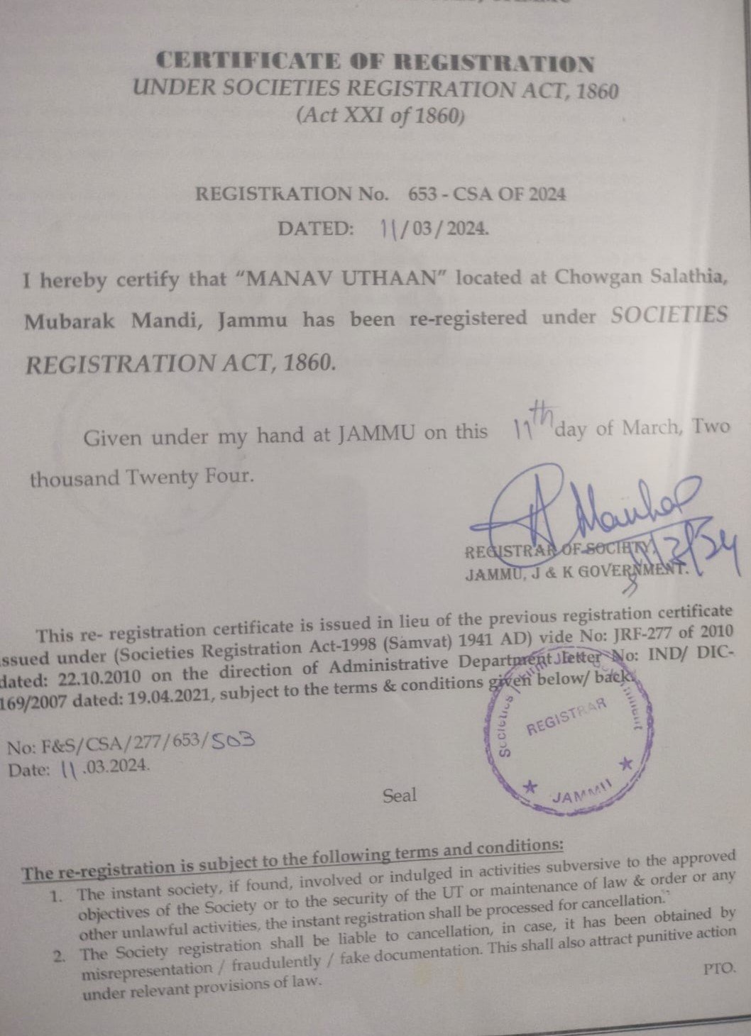 Registration of Societies Avt VI of 1998 (1941 A.D) No. JRS-277/306